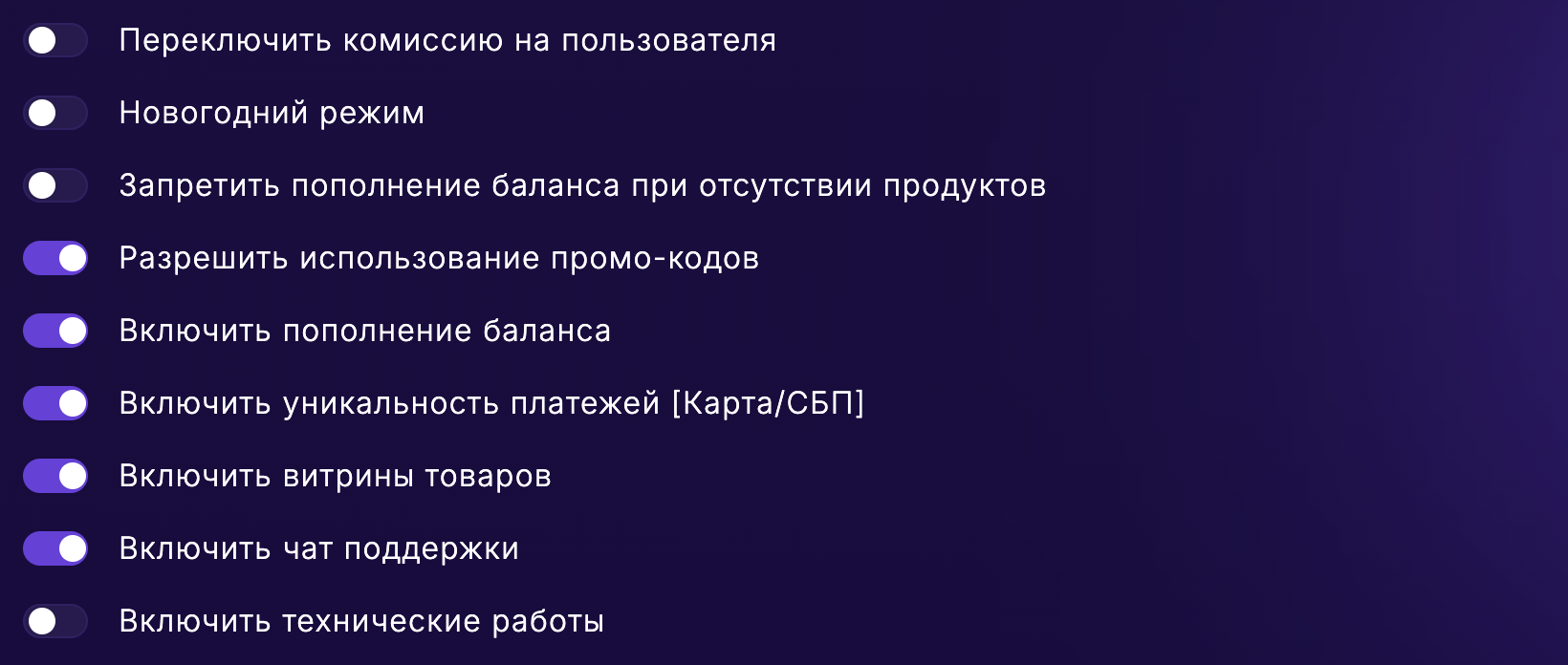 **Запретить пополнение баланса при отсутствии товаров** - Пользователи не смогут пополнять баланс, если на витрине не будет ни одного товара