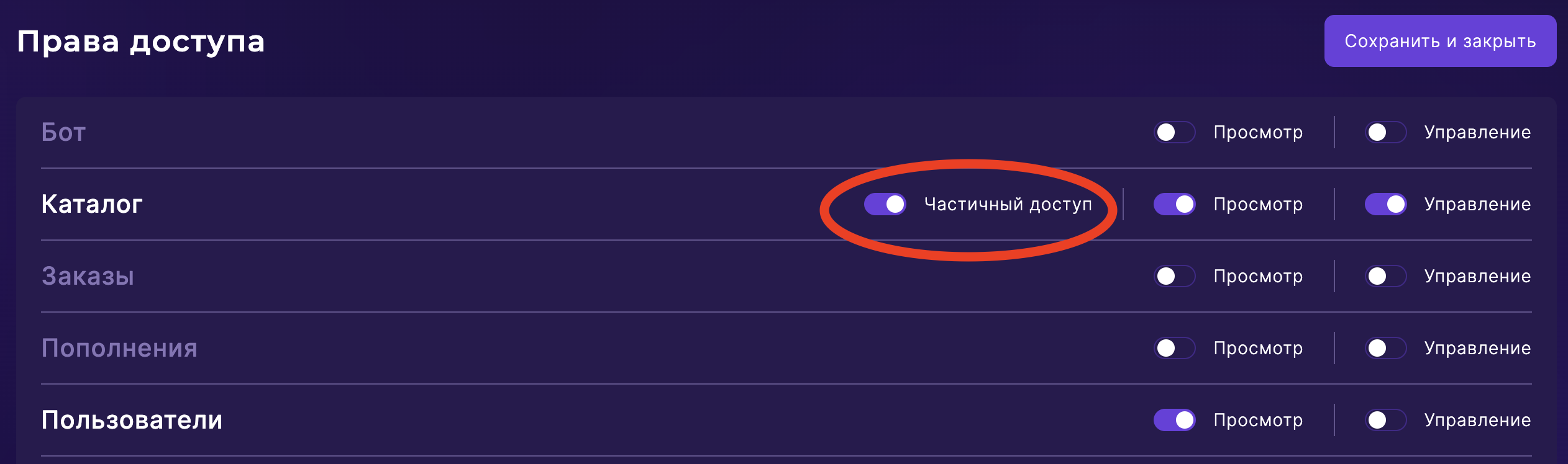 ### **Частичный доступ/Залив товара от лиц других (Каталог)**